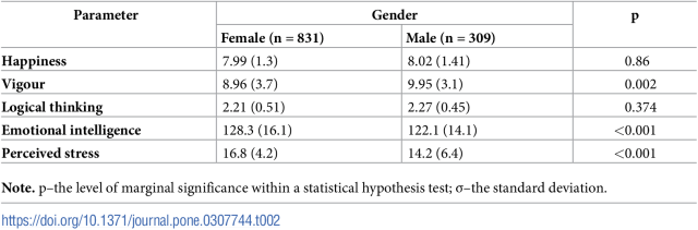 Tabela: Dados médios (σ) para felicidade, vigor, raciocínio lógico, inteligência emocional e estresse percebido em mulheres e homens.