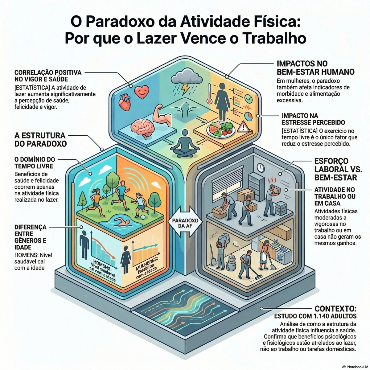 Os resultados revelaram um paradoxo da atividade física (AF) em mulheres e homens em termos de saúde, felicidade, vigor e estresse percebido, e apenas em mulheres em relação à morbidade e à alimentação excessiva.
