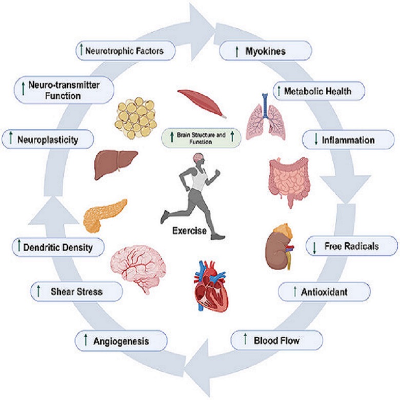 Os mecanismos pelos quais o exercício exerce um efeito neuroprotetor ainda precisam ser elucidados, mas podem estar relacionados à manutenção do volume cerebral e da sobrevivência neuronal, à melhora da densidade e função cerebrovascular e/ou ao aumento da plasticidade sináptica. Além disso, há evidências crescentes que sugerem que os efeitos benéficos do exercício sobre a saúde cerebral e a função cognitiva são, pelo menos em parte, mediados por fatores liberados pelo músculo esquelético durante a contração.