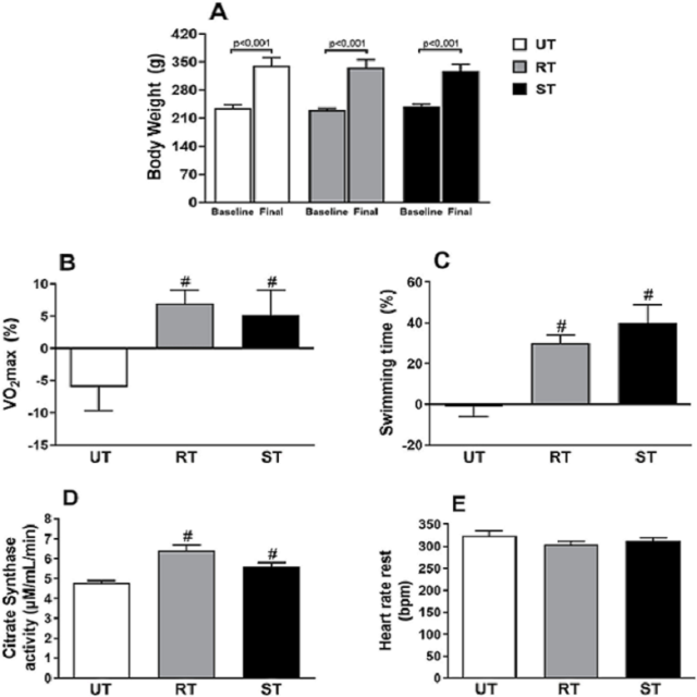 Todos os grupos apresentaram aumento de peso corporal durante o acompanhamento (Fig. 1 A). O programa de treinamento teve duração total de nove semanas, incluindo um período inicial de adaptação ao exercício, com sessões de 60 minutos por dia, cinco dias por semana, a uma intensidade de aproximadamente 75% do VO₂máx. O VO₂máx dos grupos RT e ST aumentou significativamente em mais de 5%, enquanto o do grupo não treinado diminuiu (Fig. 1 B). Além disso, os ratos treinados nadaram por mais tempo durante o teste de exaustão, e os dois protocolos de exercício foram igualmente eficazes no aumento da atividade da citrato sintase muscular (Fig. 1 C-D). O treinamento físico não afetou a frequência cardíaca em repouso (Fig. 1 E).