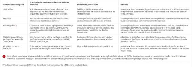 Tabela. Risco de arritmia relacionado ao exercício e orientações sobre atividade física em diferentes subtipos de cardiomiopatia pediátrica.