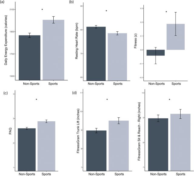 - melhor saúde física, conforme indicado pelo gasto energético diário (esportes: 1950,15 ± 476,09 calorias, não esportes: 1800,84 ± 469,22 calorias; P = 0,04),