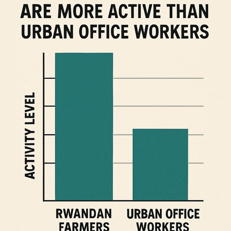 Constatamos que os agricultores rurais ruandeses apresentam algumas das maiores taxas metabólicas de atividade física já medidas em humanos, enfatizando a magnitude da transição da atividade física e sugerindo que a agricultura de subsistência pode exigir gastos energéticos muito maiores em comparação não apenas aos estilos de vida industriais, mas também à caça e à coleta.