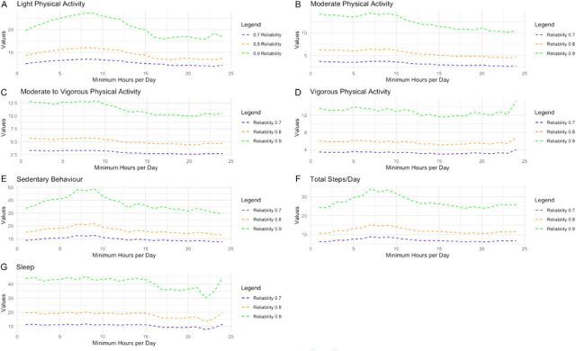 - Para atingir uma pontuação de confiabilidade de 0,7, a atividade física moderada a vigorosa exigiu de 3 a 4 dias, a atividade física leve exigiu de 4 a 7 dias e o comportamento sedentário exigiu de 8 a 13 dias.