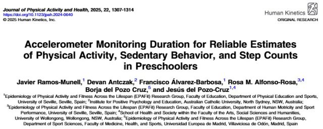 Citação: Ramos-Munell, J., Antczak, D., Álvarez-Barbosa, F., Alfonso-Rosa, R. M., del Pozo Cruz, B., & del Pozo-Cruz, J. (2025). Accelerometer Monitoring Duration for Reliable Estimates of Physical Activity, Sedentary Behavior, and Step Counts in Preschoolers. Journal of Physical Activity and Health, 22(10), 1307-1314.