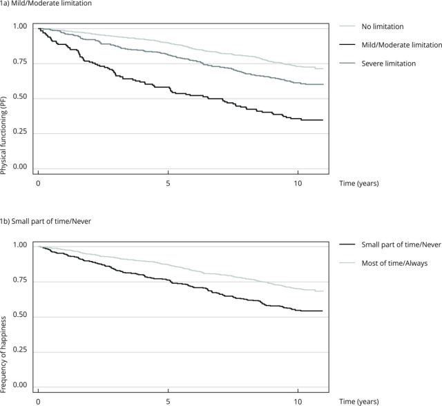 As variáveis de interesse foram a funcionalidade física (ausência/presença de limitações) e a frequência do sentimento de felicidade. Foram traçadas curvas de sobrevivência de Kaplan-Meier e realizada a análise de regressão de Cox para o cálculo das razões de risco (RR).