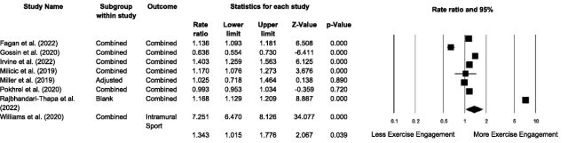 A meta-análise incluiu oito estudos com um total combinado de 508.207 participantes com idades entre 13,0 e 25,5 anos. A análise revelou uma razão de chances de 1,343 (intervalo de confiança de 95%, 1,015–1,778; P < 0,05, k = 8) usando o modelo de efeitos aleatórios.