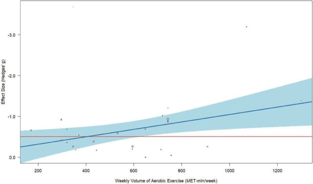 - Além disso, o exercício aeróbico apresentou um efeito dose-resposta de −0,01 (IC 95% −0,016 a −0,002, p=0,014) por 10 minutos equivalentes metabólicos de tarefa por semana (MET-min/semana) na gravidade dos sintomas depressivos.