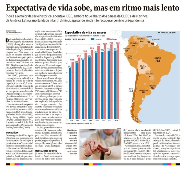Dados do Instituto Brasileiro de Geografia e Estatística (IBGE) divulgados nesta sexta-feira mostram que a expectativa de vida da população brasileira chegou aos 76,6 anos em 2024.