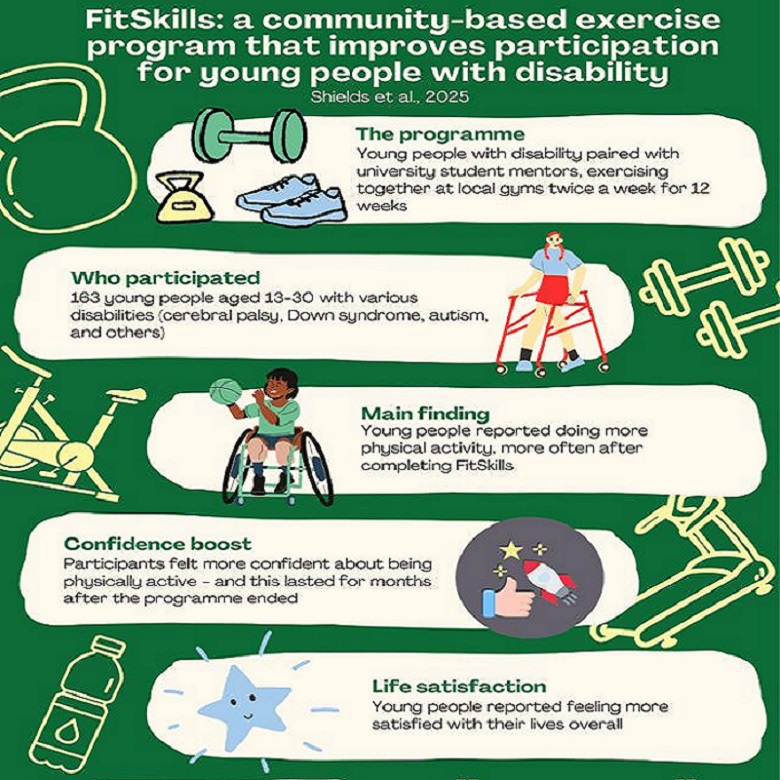 Um programa de atividade física de 12 semanas, baseado na comunidade e com mentoria de estudantes ( FitSkills ), mostrou-se eficaz no aumento da participação, na melhoria da confiança para praticar exercícios e na satisfação com a vida entre jovens com deficiência.