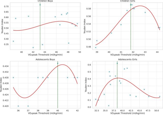 Figura. Curvas de suavização de dispersão ponderada localmente (LOWESS) que representam a relação entre os limiares de pico de VO₂ ( mL/kg/min) e a acurácia diagnóstica (Índice de Youden) em quatro subgrupos demográficos: meninas e meninos (crianças e adolescentes).