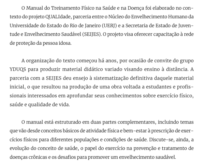 Livro – Manual de Treinamento Físico na Saúde e na Doença – 2025 Baixe a versão completa do livro nesse LINK. Baixe a versão completa do livro nesse LINK. Compartilhe: Timóteo AraújoProfissional de Educação Física, com experiência de 25 anos na área da Atividade Física, Vida Ativa e Longevidade. Atuando no Centro de Convivência AMI - Bem Estar.