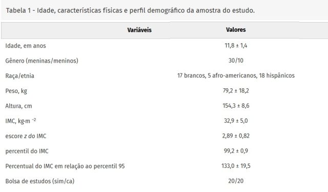 Avaliamos a morfologia do pé e a marcha de 40 crianças com índice de massa corporal (IMC) ≥ percentil 97,3 (11,4 ± 1,4 anos; 75% meninas; 17 brancas, 5 negras, 18 hispânicas) que participaram de um programa residencial de férias de verão com duração de duas semanas.