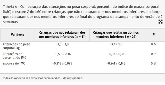 - Melhorias significativas ( P < 0,001) no peso corporal (−3,6 kg), IMC (−1,53 kg·m⁻² ) , percentil do IMC (−0,37) e escores z do IMC (−0,235) foram detectadas na coorte, sem diferenças significativas com base na presença ou ausência de dor.