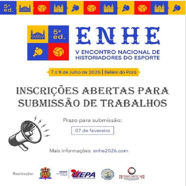 O V Encontro Nacional de Historiadores do Esporte ocorrerá na cidade de Belém, no período de 7 a 9 de julho de 2026, e contará com apoio da Universidade do Estado do Pará (UEPA) e do grupo de pesquisa RessignificaЯ. O evento será dedicado à memória do Prof. Rafael Fortes Soares (1978-2024), uma das principais referências em História do Esporte e personagem de destaque na consolidação deste campo de estudos no Brasil.