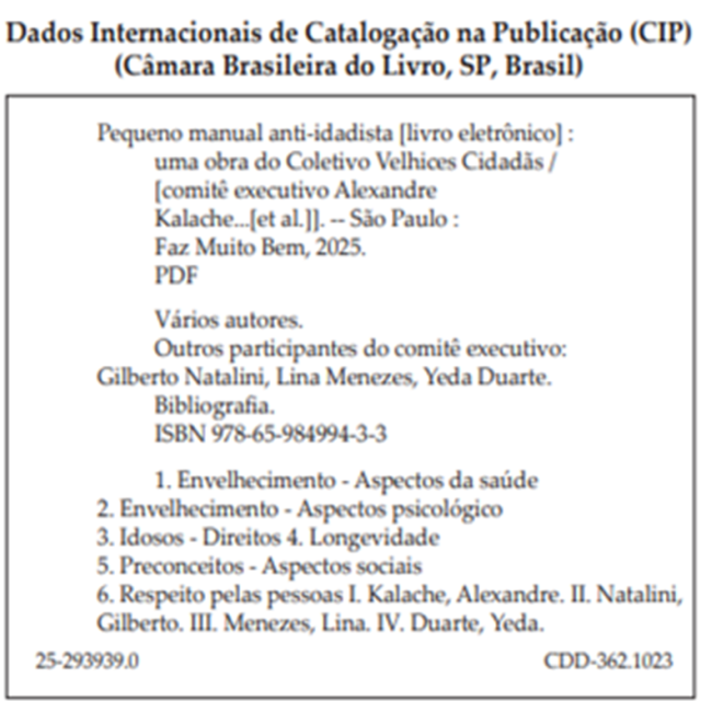 Acesso gratuito para a versão digital do Pequeno Manual Anti-idadista por meio desse LINK. O manual nos inspira a alinhar conceitos, rever discursos, transformar narrativas e agir — para que envelhecer no Brasil seja, de fato, um direito social respeitado, garantindo dignidade, equidade e felicidade para todas as idades.