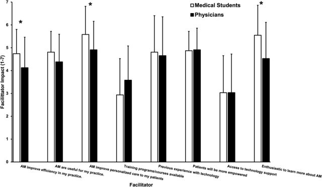Figura 1 – Médias das avaliações em escala Likert (1 = discordo totalmente, 7 = concordo totalmente) para os facilitadores percebidos do uso de monitores de atividade (MA) na prática clínica entre médicos e estudantes de medicina. Valores mais altos indicam percepções mais positivas em relação à inclusão de MA na prática.