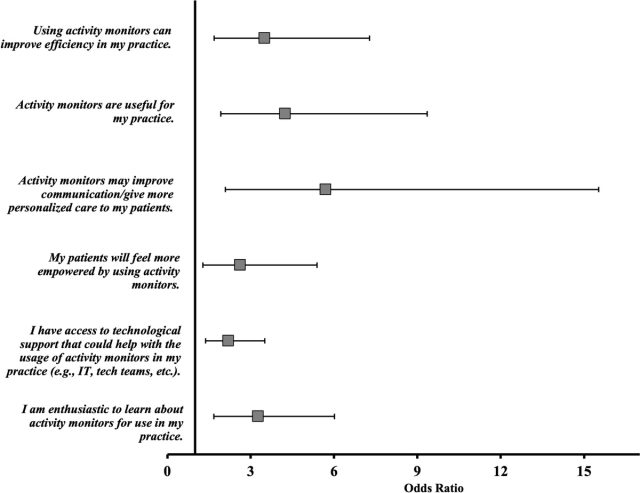 - Uma crença mais forte de que os dispositivos vestíveis melhoram a eficiência, a utilidade, a comunicação e o empoderamento do paciente, juntamente com a disponibilidade de suporte técnico, estiveram associadas a um maior interesse em sua adoção (todos os valores de P > 2,20, P < 0,001).
