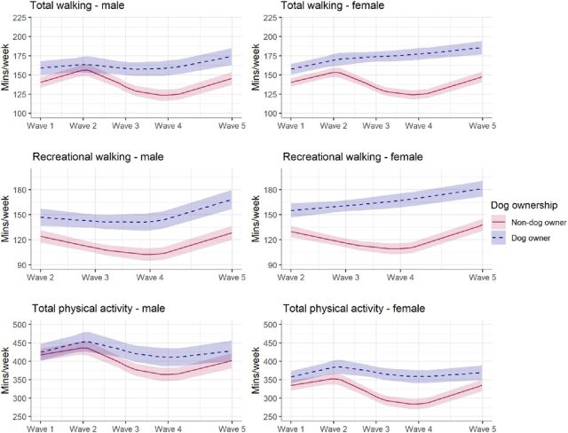- As medidas foram comparadas entre homens (n = 4587) e mulheres (n = 5996) utilizando modelos lineares de efeitos mistos com interações entre posse de cão e tempo, ajustados para características sociodemográficas.