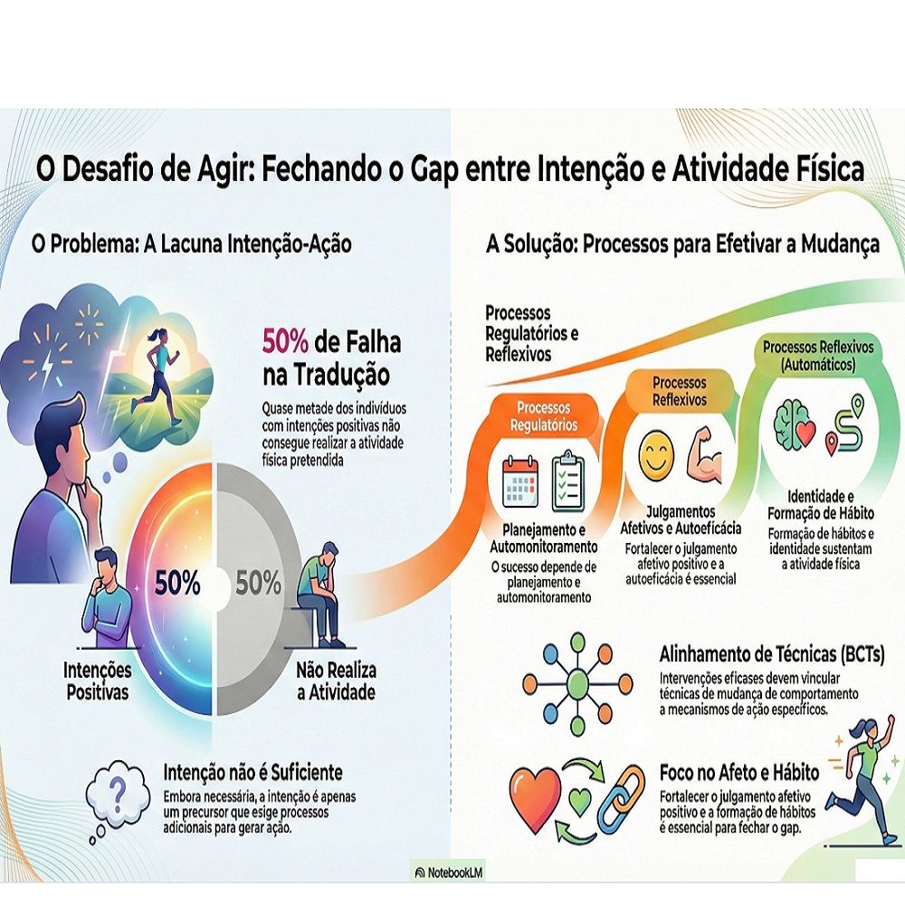 Esta visão geral visual das evidências examina a lacuna entre intenção e atividade física (I-AF), onde intenções positivas frequentemente não se traduzem em comportamento, um desafio central na promoção da atividade física (AF).