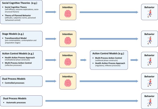 Figura 2 – O papel da intenção nas teorias e modelos comportamentais. A intenção é central em muitas teorias de mudança de comportamento, atuando como mediadora entre influências prévias e o comportamento, com modelos de controle da ação que vão além da intenção.