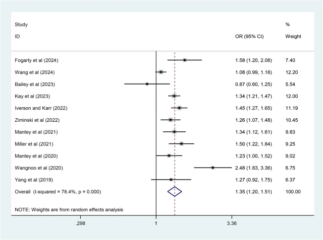 A meta-análise de 11 estudos sobre a associação entre concussão e elaboração de plano de suicídio mostrou heterogeneidade significativa entre os estudos (I² = 78,4%, p < 0,001), portanto, foi utilizado um modelo de efeitos aleatórios. O resultado agrupado indicou que um histórico de concussão estava associado a um aumento significativo na probabilidade de elaboração de plano de suicídio (OR = 1,35, IC 95%: 1,20–1,51, p < 0,001) (grafico).