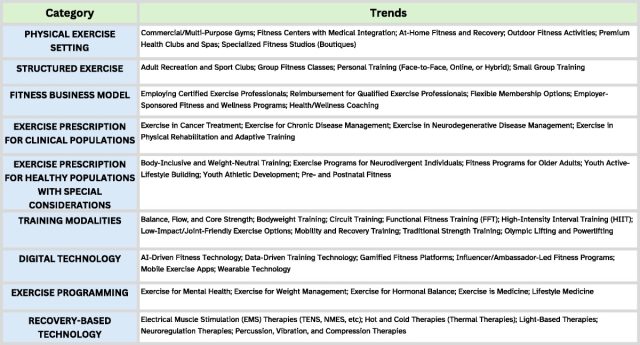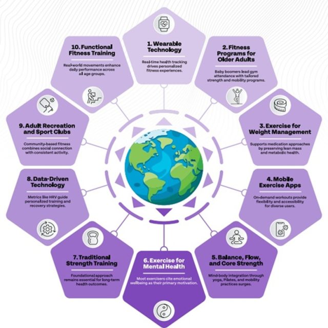 Em 2025, a indústria do fitness foi caracterizada pela integração de ferramentas digitais de saúde, um foco maior na longevidade e recuperação e uma demanda crescente por opções de exercícios personalizadas e baseadas em evidências. Esses desenvolvimentos foram apoiados pela utilização contínua de modelos de treinamento híbridos, combinando serviços presenciais com programação virtual ou baseada em aplicativos, e por novas tecnologias que fortaleceram o vínculo entre atividade física (AF) e resultados de saúde mais amplos.