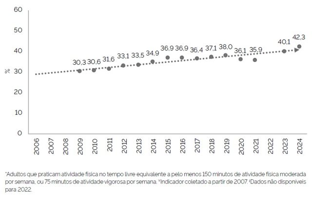 Prática de atividades físicas no tempo livre A frequência de adultos com prática de atividade física no tempo livre equivalente a pelo menos 150 minutos de atividade física moderada por semana aumentou no período entre 2009 e 2024, variando de 30,3%, em 2009, a 42,3% em 2024 (aumento médio de 0,66 pp/ano) Figura 1).