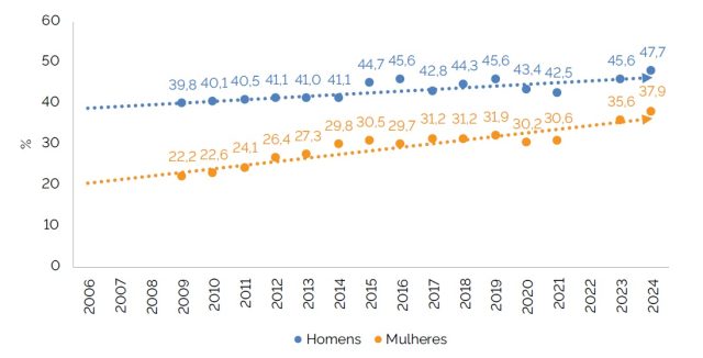 Esse aumento foi observado em ambos os sexos, com maior aumento entre as mulheres, variando de 22,2%, em 2009, a 37,9% em 2024 (0,89 pp/ano) (Figura 2). No entanto, a análise do período mais recente, entre 2019 e 2024, indicou relativa estabilidade para a população total, sem variação significativa no período.
